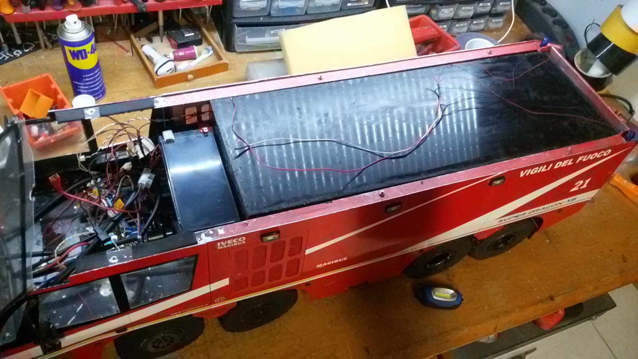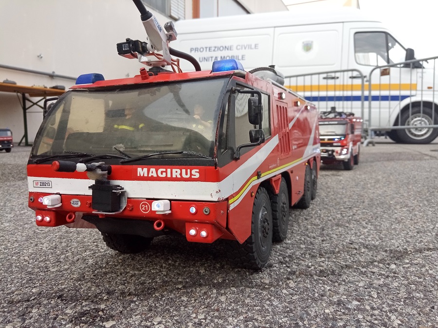 ....ora il progetto si può dire concluso si tratta di un vero mostro dal peso a pieno carico di 17 kg, dispone di due cisterne da 5 litri ciascuna e' una di queste puo' essere caricata di schiuma, sono tre le pompe che spingono acqua o schiuma su un monitor principale , su un Bumper frontale e su un naspo disposto in un vano sulla fiancata del mezzo. Ben 12 canali assicurano la gestione di tutte le funzioni operative del modello , guida e cambio a tre velocità 2 selettori posti sul tetto permettono la gestione dei diffusori posizionati immediatamente davanti alle ruote posteriori mentre un'altro e' posizionato sopra l'ampio parabrezza garantendone protezione di fronte a grosse fonti di calore . Il modello e' dotato di sirena bitonale lampeggianti attivabili da remoto oltre che alla centralina MFC che garantisce tutti i rumori rerlativi al motore , sfiati d'aria freni , vibrazioni motore e tutti gli effetti luce fari antinebbia frecce e luci hazzard....